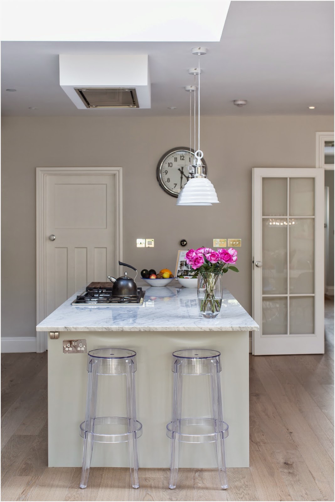 The kitchen was designed to be elegant as well as functional and the colour scheme for the space was fresh and clean to maximise the lovely natural light. I used furniture and artwork to add pops of colour. I hope you like it!