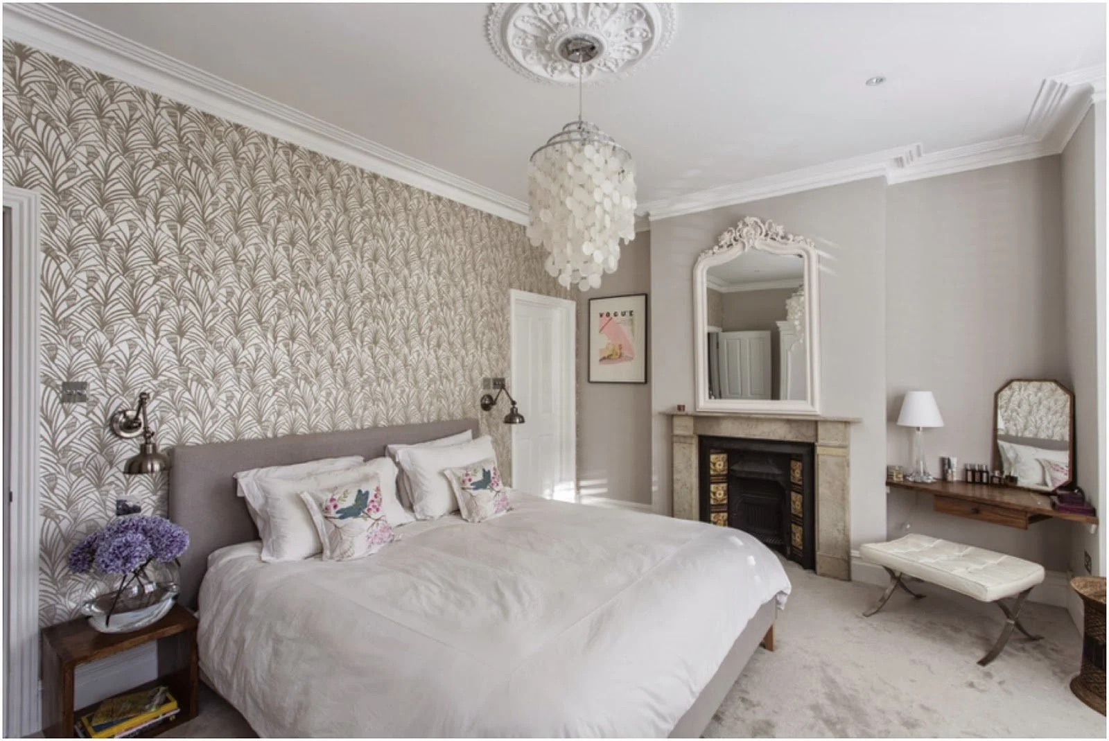 The Art Deco accents give the space character; the wallpaper, chandelier and walnut dressing table all were inspired by my love of the 1920s. I loved working with the original features in the room as well as reinstating them where they had been taken out; the fireplace we moved from another room to reinstate this important feature in the master bedroom. In Victorian houses, all living rooms and bedrooms would have had a fireplace, as it was their only form of heating. They are usually very decorative and unique, like the one in these pictures.